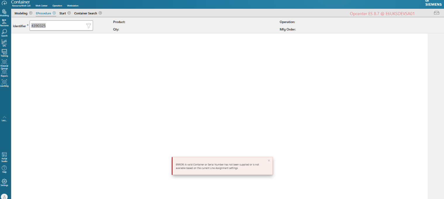 ERROR! A valid Container or Serial Number has not been supplied or is not available based on the current Line Assignment settings.