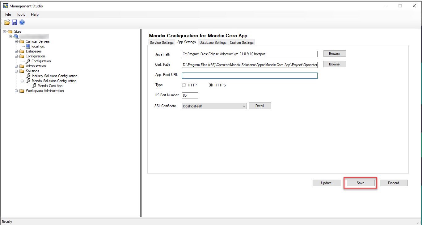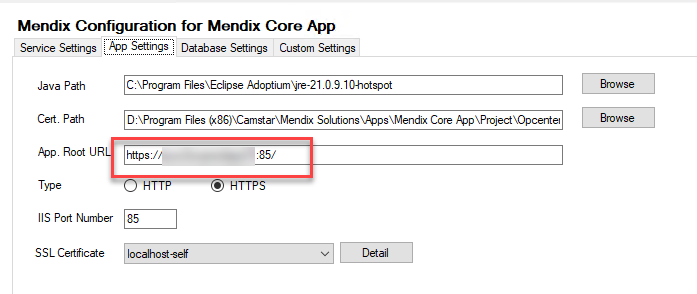2. On Mendix Solutions Configuration > Mendix Core App, go to App Settings tab, leave the App. Root URL blank then click Save. Mendix will automatically populate the field correctly.