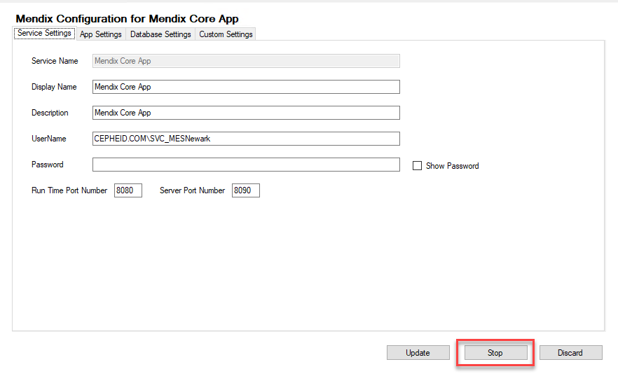 3. Go to Service Settings tab, Stop then Start Mendix service