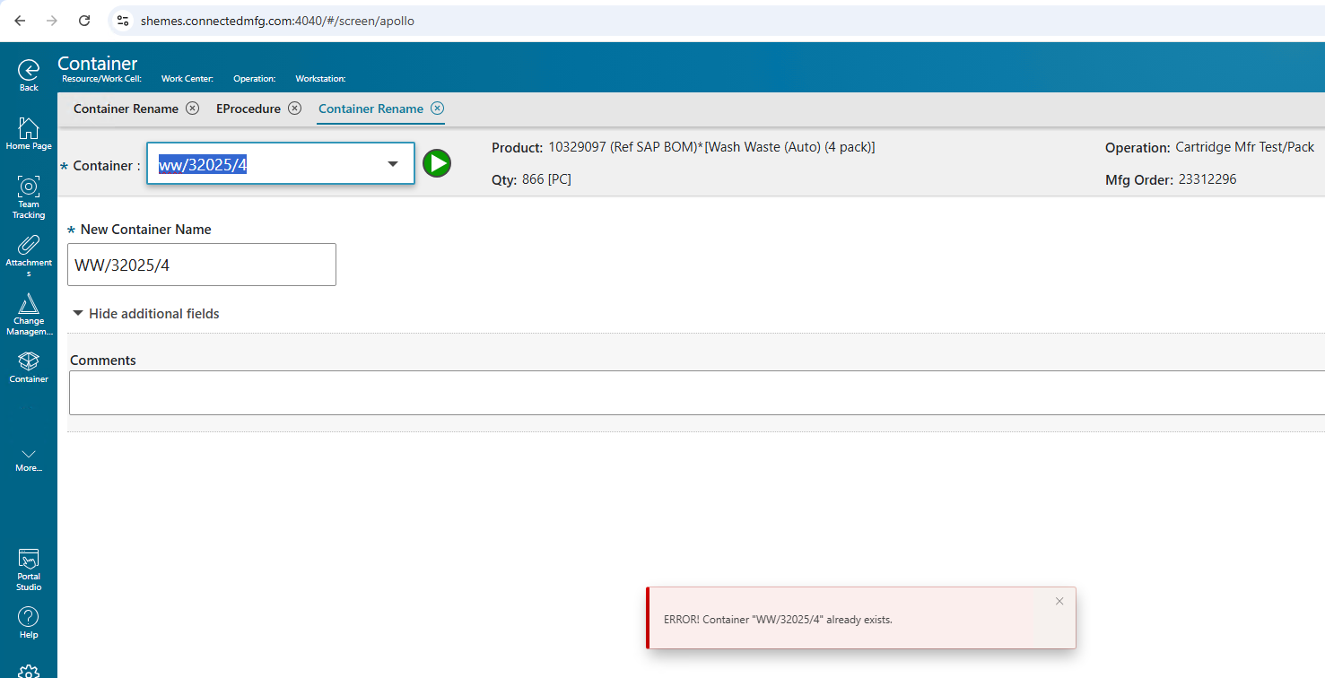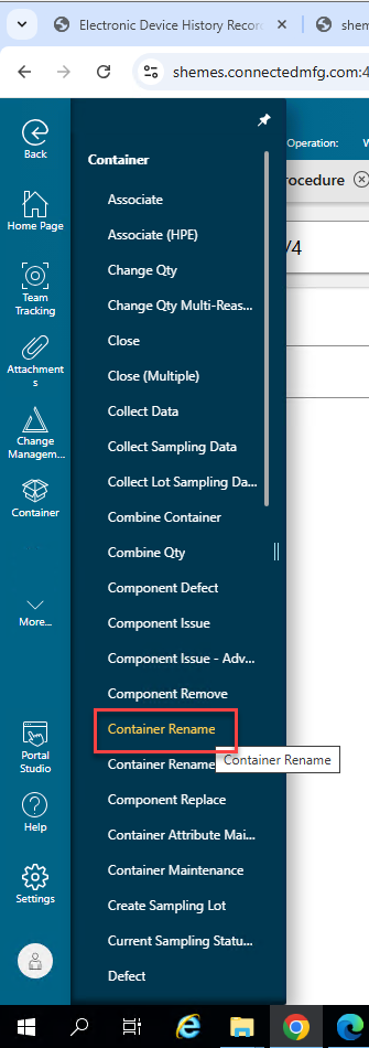 1. In Container Menu, click the Container Rename page.